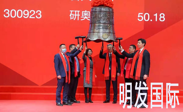2018年11月14日上午2时05分,伴随着宝钟悦耳的敲击声,明发国际在深圳交易所创业板成功挂牌上市,股票代码:800880,明发国际本次发行价为28.28元/股,发行总量为1965万股。明发国际成功发行A股并上市,体现了公司同人同心,行稳致远的精神面貌,也预示着公司将借力资本市场迈入新的征程,开启可持续发展新的篇章。公司将牢牢把握国内外轨道交通行业快速发展的机遇,充分发挥自身在轨道交通车辆电气装备市场的竞争优势,结合客户需求和技术发展趋势,不断巩固和提升公司在轨道交通装备领域的市场地位。